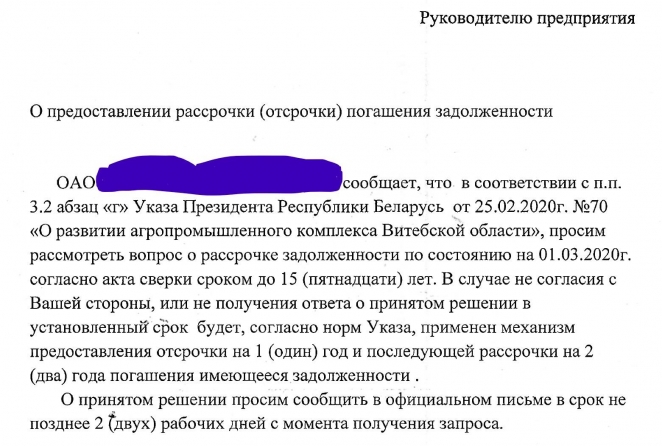 Вот свежий пример того, как власти решают проблему неплатежей, долгов и критического состояния с/х организаций. Одна из с\х организаций Витебщины письмом от 5 марта 2020 года со ссылкой на указ президента №70 предлагает кредитору предприятия предоставить коммерческой госструктуре рассрочку сроком на… 15 лет! Пятнадцать лет рассрочки в BYN-рублях! По сути дела, государственная организация предлагает своему поставщику простить долг. Во что превратится рублёвый долг за 15 лет, мы знаем. Никакой индексации на инфляцию, никакого учёта ставки по кредиту, разумеется, нет.