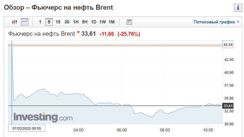 Котировки нефти марки Brent сегодня в моменте обвалились до 31,3 долларов за баррель, а потом отросли до 33,5 долларов. Но в минувшую пятницу биржи закрылись на уровне 45,54 долларов за бочку. Стоимость нефти рухнула на 30% всего за десяток минут.