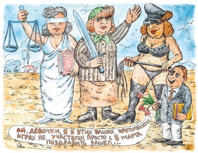Понимаете, мужики, о чем речь? Белорусским государством управляют женщины. Белорусскую политику делают женщины. Беларусь - она сама женщина, к тому же бюджетница, причем не исключено, что чиновница. Теперь вы чувствуете, почему так странно звучат и русское «держава», и белорусское «дзяржава», и старославянская «дръжава»? Государство - это когда женщина жесточайше держит обуреваемый страстями мужской электорат понятно за что. Крепко держит, надежно, нужно отдать ей должное. Чтобы мужик работал, а не раскачивал лодку своим необузданным честолюбием, своим инфантильным авантюризмом, своей нелепой агрессией. В крайнем случае - чтобы платил алименты и не отсвечивал. Не ставил под сомнение своей ангажированностью выстраданную сильной и независимой женщиной многовекторность.