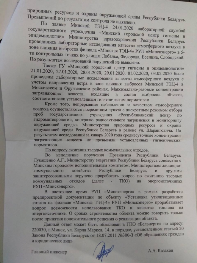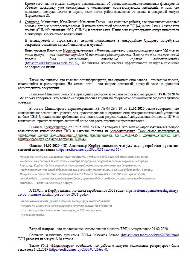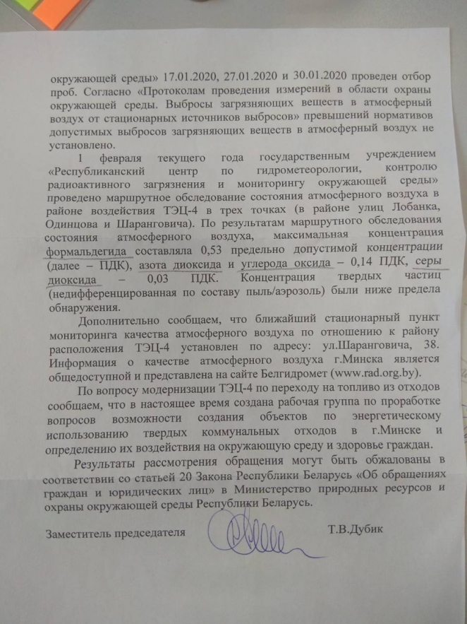 «Она полностью нас поддерживает. Она накануне получила письмо, которое мы отсылали ней, и обсудила его с Панасюком [Депутатам Василием Панасюком. – Ред. Belsat.eu]. Это бывший директор ТЭЦ. Он также категорически против. Они видят, что чуть ли не весь Минск умрет, если эта идея будет реализована. Это очень вредное производство», – отмечает Ирина.