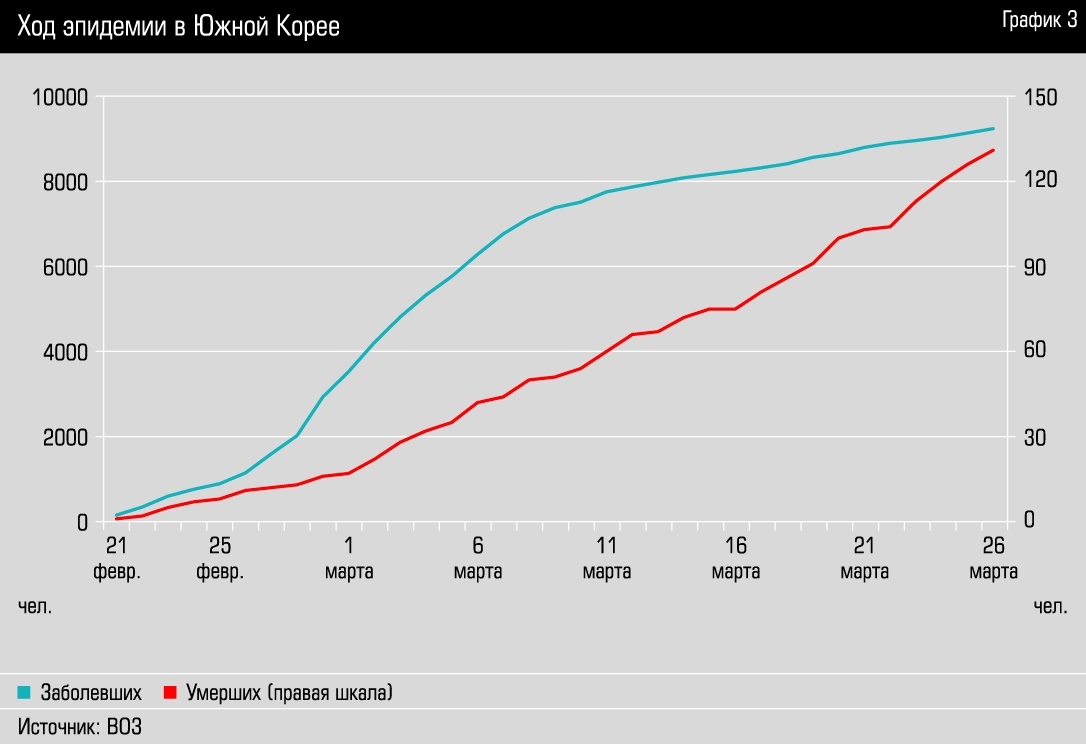 Длительность мер также связана с инкубационным периодом. Если для COVID-19 он составляет не менее пяти дней, то недельный «жесткий» карантин должен резко замедлить распространение вируса, однако еще необходимо, чтобы уменьшилось общее число уже больных, на это требуется еще не менее десяти дней. Помочь может массовое тестирование, как происходит в США и Южной Корее. В Южной Корее проводили до 15 тыс. тестов каждый день с того момента, как заболевших стало больше ста, и быстро выявили инфицированных, благодаря чему жесткий карантин вводить не пришлось. Из графика 3 видно, что эпидемия в Южной Корее началась в двадцатых числах февраля, тогда же, когда и в Италии; население этих стран сравнимо, но его плотность в Корее в несколько раз выше. Тем не менее масштабных проблем удалось избежать.