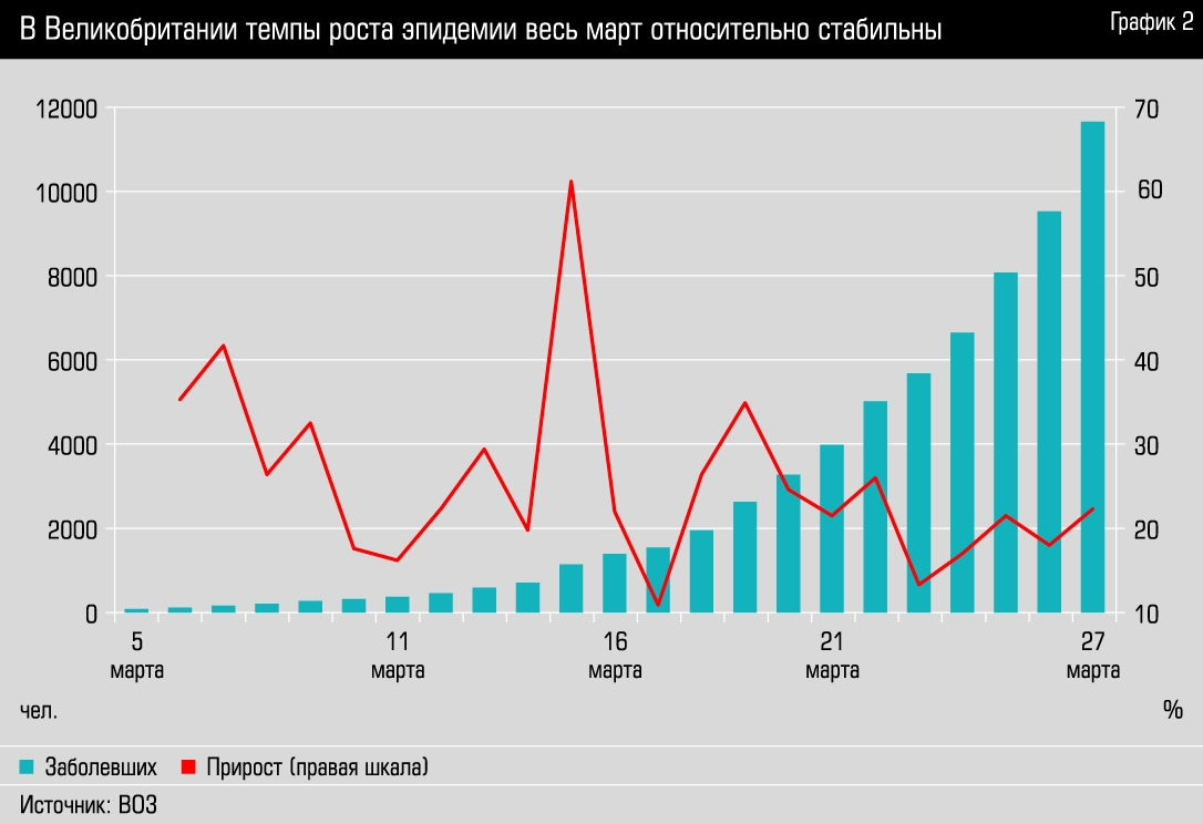 Скорость распространения вируса начинает падать после того, как в стране принимают меры по сокращению контактов между людьми (это снижает число R0). При этом степень снижения зависит от момента и жесткости принятых мер. Самый жесткий вариант был в Ухане — перемещения людей полностью остановили. В среднем варианте, как на прошлой неделе призвал вести себя британцев премьер-министр Борис Джонсон (из графика 2 видно, что темпы роста эпидемии в Великобритании весь март стабильны, тысячу заболевших страна прошла 14 марта), теперь что-то подобное происходит в Москве, большинство людей должны максимум времени проводить дома.