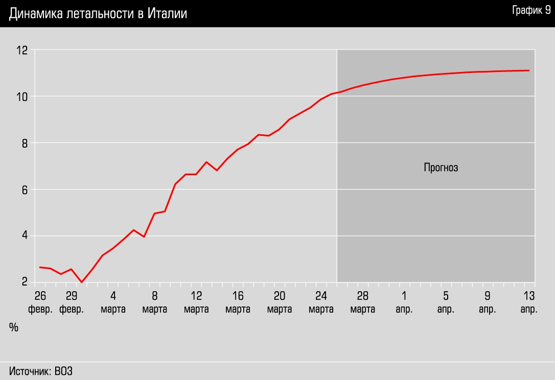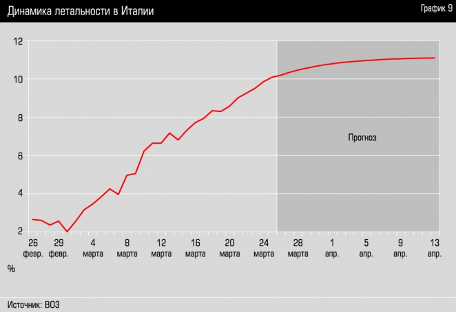 Если рассматривать летальность, то она радикально различается по странам. Наивысшие показатели в Италии (см. график 9), причем прогноз показывает близость показателя к выходу на плато — к 11%.