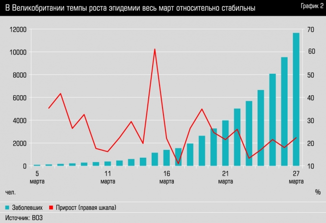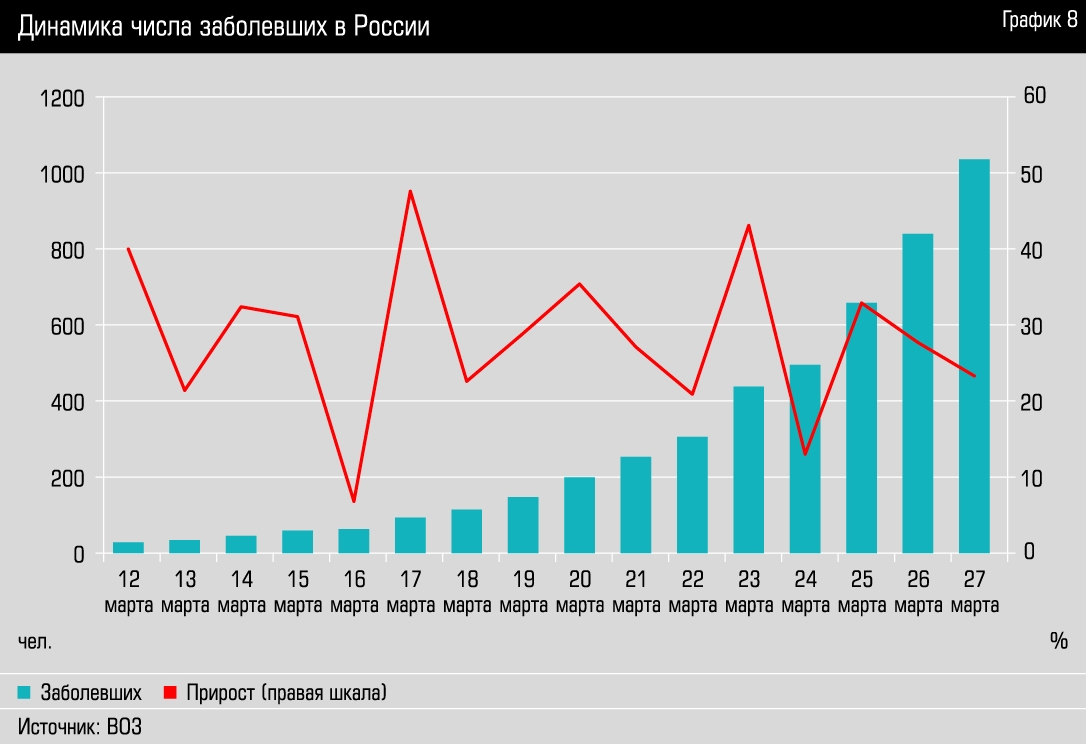 На путь от тысячи до десяти тысяч заболевших Великобритании потребовалось еще 13 дней. Италии, Германии и Испании — меньше: девять-десять дней. Опыт этих стран показывает, что именно десятидневный период после достижения тысячи заболевших будет определять общую картину эпидемии в стране. России удалось максимально далеко оттянуть этот момент — сработали своевременно принятые решения о закрытии границ с Китаем, а затем и с другими странами. Уже сейчас можно сказать, что картину распространения COVID-19 в России определит первая неделя апреля и сдерживающие меры, связанные с нерабочей неделей.