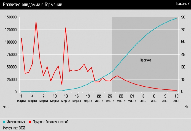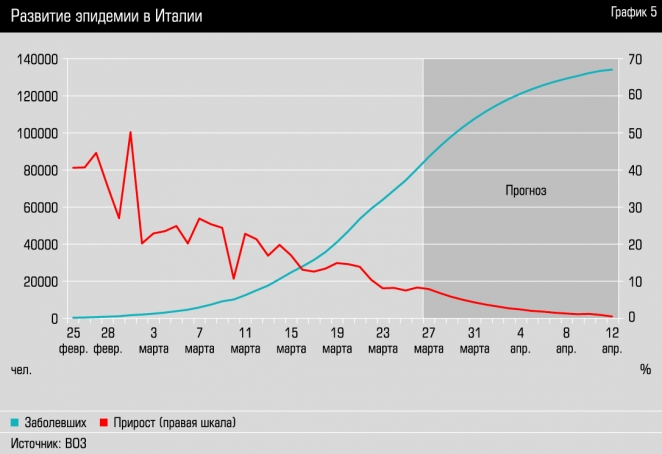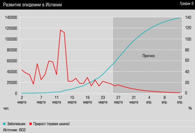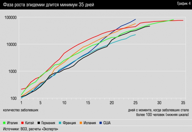 Масштаб эпидемии и темпы роста числа заболевших отличаются, страны вступают в острую фазу последовательно. Например, в России число заболевших перевалило за тысячу только 27 марта — через месяц после Италии и через 18 дней после Германии и Испании. Так, в Германии 9 марта было всего 1040 случаев коронавируса, а в день выявляли немногим более ста новых заболевших, но уже к 20 марта количество ежедневных случаев превысило четыре тысячи, а всего больных стало больше двадцати тысяч. Теперь, когда в Италии темпы роста эпидемии начали медленно снижаться, в остальных странах ЕС пик заболеваемости еще впереди, хотя уже близок. Ход эпидемии имеет три фазы: резкий прирост, стабилизация (достижение пика заболеваемости) и начало угасания. Опыт первых в очереди стран Европы показал, что фаза роста занимает не менее четырех недель, и это позволяет оценить перспективы развития эпидемии, в том числе в России.