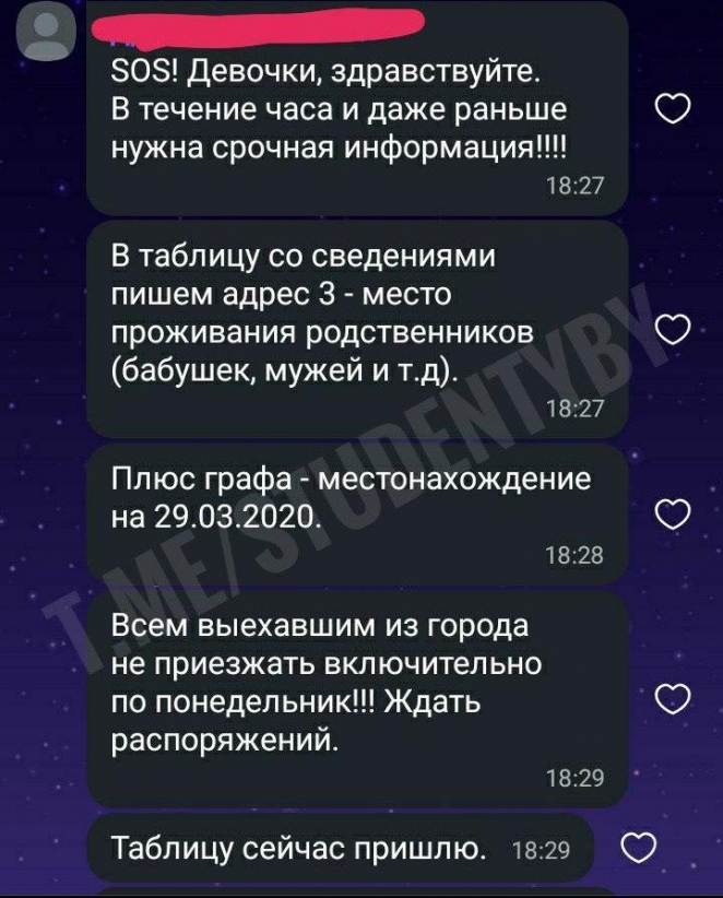 Как пишет портал TUT.BY, по информации телеграм-канала, студентам сообщили, что иногородним ребятам, кто уехал из Витебска на выходные, не нужно приезжать на занятия "включительно по понедельник", 30 марта. А дальше — "ждать распоряжений".