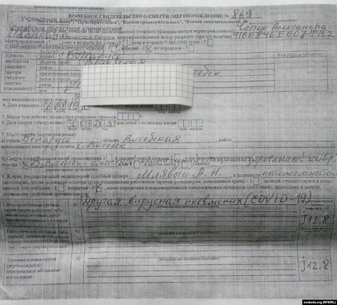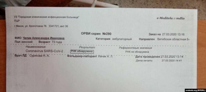 Жительница Витебска Александра Чепик умерла утром 30 марта в витебской больнице. В свидетельстве о смерти женщины написано «другая вирусная пневмония (COVID-19)». На похороны побоялись прийти даже близкие друзья, пишет «Радио Свобода».