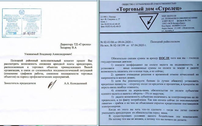 Все началось с того, что Полоцкий райисполком в лице заместителя председателя А.Колодынского обратился к бизнесмену с просьбой о снижении арендной платы арендаторам, которые занимают площади в принадлежащем Захарову здании. Казалось бы, намерения исполкома благие: о невозможности платить аренду в данный период неоднократно заявляли предприниматели.