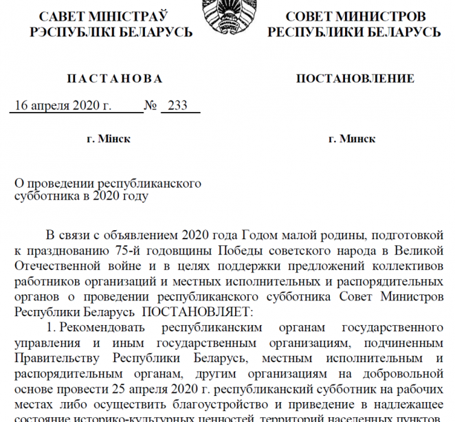 - Постановление Совета Министров № 233 от 16 апреля 2020г. «О проведении республиканского субботника в 2020 году» - это особый документ белорусской власти.