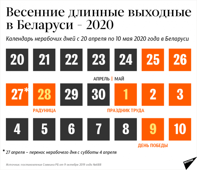 Календарь нерабочих дней с 20 апреля по 10 мая 2020 года в Беларуси с учетом переносов – в инфографике Sputnik.