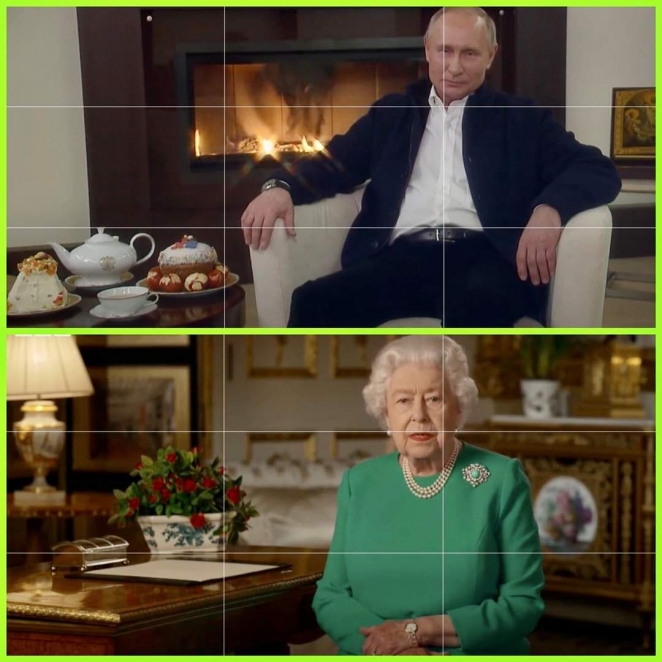 Королева сидит в одежде нефритового цвета. Ни рядом, ни вокруг нее нет такого цвета и его оттенков. Таким образом, ее фигура отделена от пространства. Путин же — в брюках и кофте цвета камина. Где тут президент, а где облицовка — не сразу поймешь.