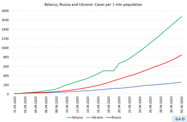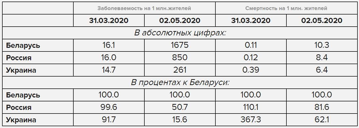 На 31 марта заболеваемость в Беларуси была практически такой же, как в России и Украине – в пределах 14,7 – 16,1 заболевших на 1 млн жителей. На 2 мая заболеваемость в Беларуси уже вдвое превышала российский уровень и более чем в 6 раз – украинский.