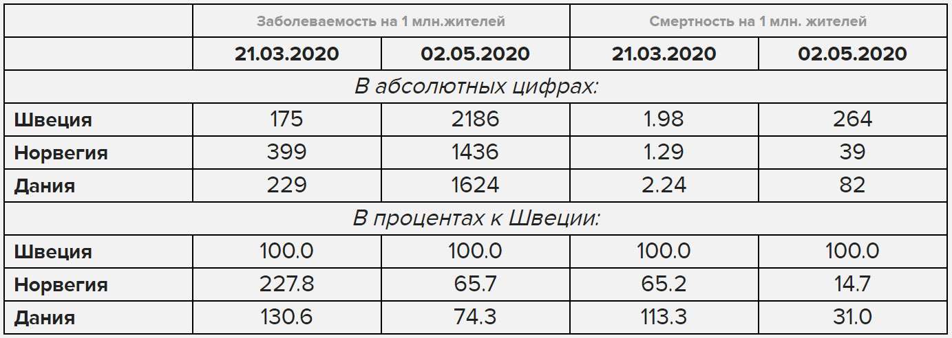Смертность в Швеции на 21 марта превышала уровень Норвегии примерно в полтора раза, на 2 мая она превысила его уже почти в 7 раз. На начало периода смертность в Швеции была ниже датской на 13%, на конец периода она превышала его уже более чем в три раза.