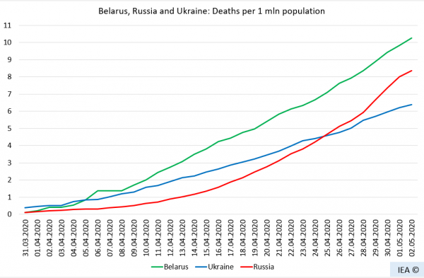 На 31 марта смертность в Беларуси была практически такой же, как в России (0.11 – 0.12 погибших на 1 млн жителей) и почти вчетверо ниже, чем в Украине. На 2 мая в Беларуси смертность почти на пятую часть (на 18,4%) превышает российский показатель и более чем на треть (на 37,9%) – украинский.