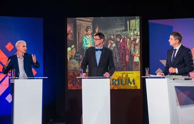 Участники ток-шоу «Intermarium»: Андрей Блануца, кандидат исторических наук (Институт истории Украины Национальной академии наук Украины, Киев), Виктор Якубов, кандидат исторических наук (Полоцкий государственный университет) и Павел Можейко. Фото: belsat.eu