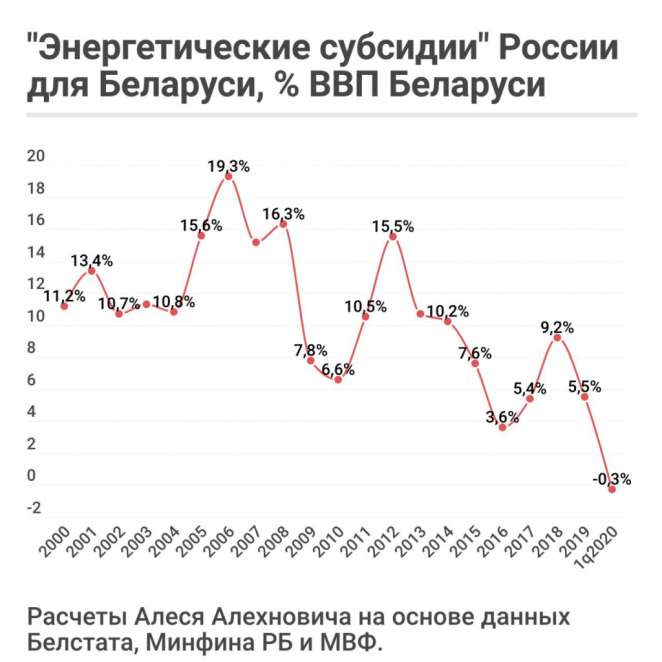 «Одним из главных ингредиентов белорусско-российской любви всегда были “энергетические субсидии” — скидка на российскую газ и нефть, которую Беларусь получала в сравнении с ценами на европейском рынке. В лучшие годы эти “энергетические субсидии” составляли около 15% нашего ВВП.