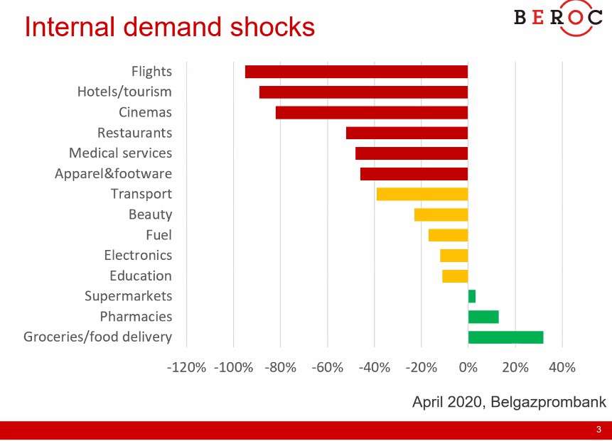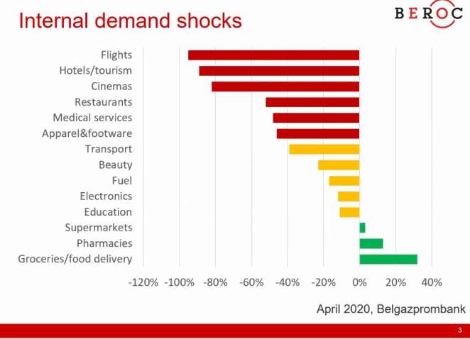 Научный директор BEROC Екатерина Борнукова заявила, что, хотя в Беларуси не вводили значительный карантин, люди стали меньше передвигаться, меньше ходить в торговые центры, что вместе со снижением доходов и общей неопределенностью негативно сказалось на внутреннем спросе. Сильно меняется и сам спрос.