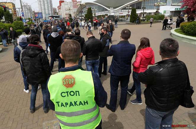 Сотни человек собрались возле Комаровского рынка. На пикете собирают подписи в поддержку «кандидата протеста» Владимира Непомнящих и жены блогера Сергея Тихановского Светланы, выдвинувшейся в кандидаты в президенты.