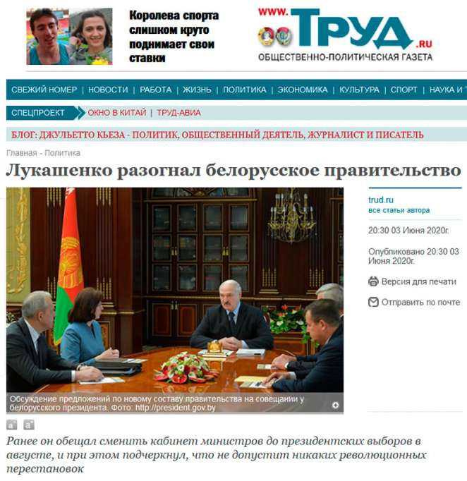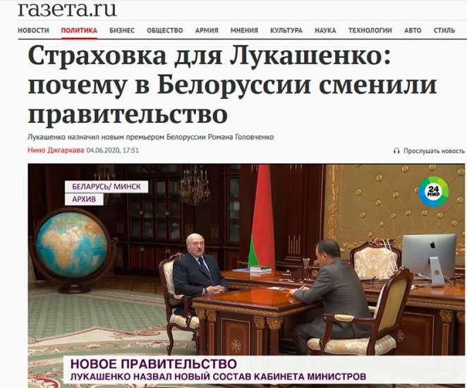 В новости из Минска о смене правительства российский «Коммерсантъ» делает акцент персоналиях новых назначенцев: «Правительство Беларуси поставили на военные рельсы». В другой публикации подчеркивает, что место в правительстве сохранили руководители МВД, КГБ и МИД.