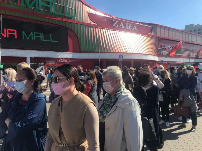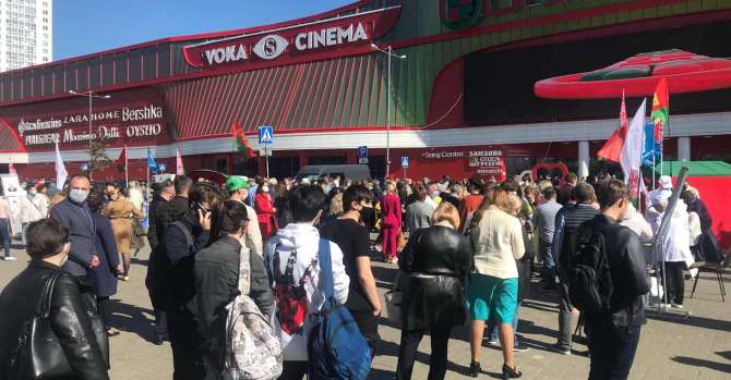 Ближе к 17 часам почти вся площадка перед торговым центром заполнена людьми. У палаток и тумб развеваются красно-зеленые флаги, из колонок звучат песни белорусских эстрадных исполнителей. Девушки в майках с надписью «БРСМ» пытаются танцевать в ритм. Мужчина в мегафон призывает «уважаемых граждан» оставить подпись за Лукашенко. Со стендов на толпу глядит фото Лукашенко в сопровождении лозунга «За Беларусь. Суверенную. Справедливую. Безопасную».