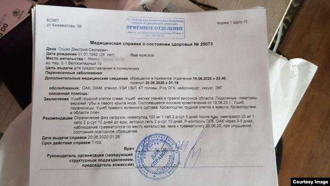 В больнице Дмитрию сделали рентген, КТ, УЗИ, забор крови. В справке, которую выдали в больнице, говорится, что у него ушиб грудной клетки слева, ушиб мягких тканей височной области, подкожные гематомы верхней губы и крыла носа, ушиб переносицы, кровотечение из носа, ушиб грудной клетки и живота, ушиб в области плеч.