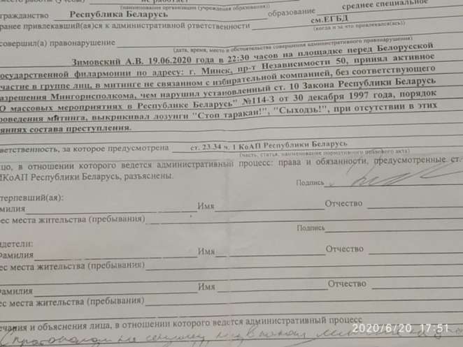 Там на юношу составили протокол о том, что якобы тот в 22.30 возле Белорусской Филармонии принимал активное участие в митинге, выкрикивал лозунги «Стоп, таракан», «Сыходзь», тем самым нарушил закон о массовых мероприятиях.