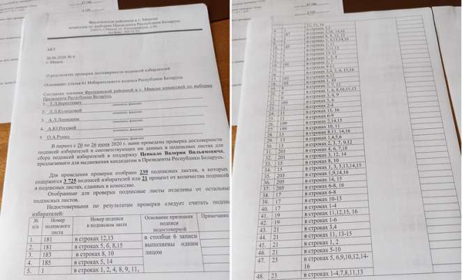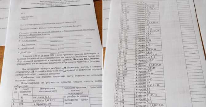 «Председателю Фрунзенской районного в г.Минске комиссии по выборам Президента Республики Беларусь. В соответствии с Вашим письмом от 27.06.2020 исх.№25… При изучении подписных листов для сбора подписей в поддержку Цепкало В.В. установлено следующее...»