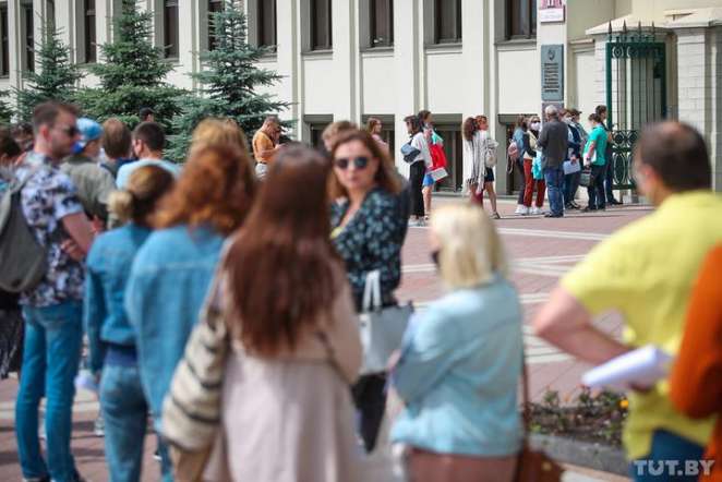 С утра 15 июля около здания в центре Минска, где размещается ведомство Ермошиной, собралась очередь из желающих подать жалобы на решение о нерегистрации кандидатами в президенты Валерия Цепкало и Виктора Бабарико.