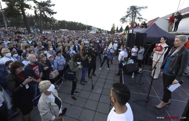 19.20. Светлана Тихановская появилась на пикете с двадцатиминутным опозданием. Вместе с ней на сцену вышла Мария Колесникова, Вероники Цепкало не видно. Перед этим появились сообщения о задержании съемочной группы телеканала «Белсат». Не смог попасть на встречу и экономист Сергей Чалый с несколькими активистами.