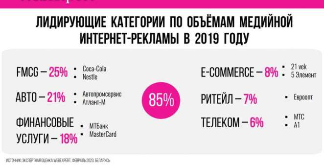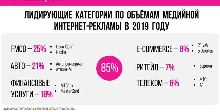 К примеру, по данным сейлз-хауса WebExpert, под эту категорию рекламодателей отводит 18% объема такой рекламы. По оценке коммерческой службы TUT.BY, — около 7%.