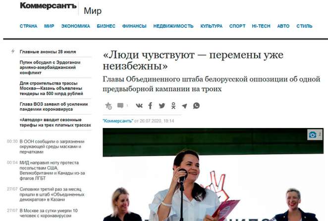 — Впрочем, нынешняя кампания, которая изначально пошла не по сценарию власти, видимо, уже не способна обеспечить победу Александру Лукашенко за счет искренних симпатий населения, которые были у него когда-то, полагают аналитики. Свидетельство тому — многотысячные митинги, которые собирает его главная конкурентка — простая белорусская переводчица Светлана Тихановская, — пишет газета.