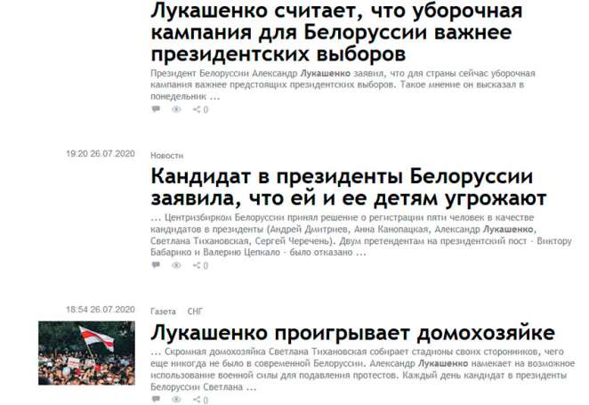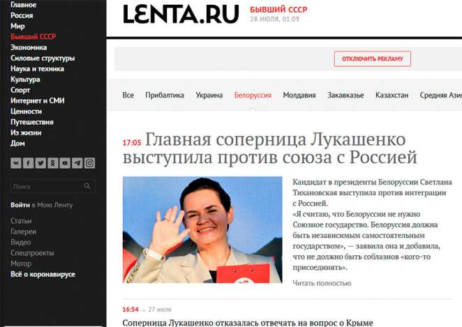 Lenta.ru в последних сообщениях о событиях в Беларуси акцентировала внимание на заявления Светланы Тихановской о союзе с Россией.