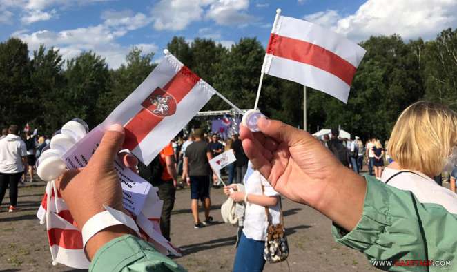 17.50. Как сообщает с места событий корреспондент «Салiдарнасцi», люди идут потоком. На пунктах пропуска их досматривают правоохранители, национальную символику не изымают. Тут же на входе стояла группа девушек, которая раздавала флажки с символами трио Светланы Тихановской, Марии Колесниковой и Вероники Цепкало. Все флажки очень быстро разобрали.