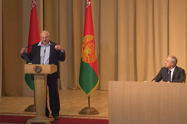 В программе «Двое из дворца» также показали любопытный эпизод из выступления главы государства в бригаде 3214. Во время речи на трибуне Лукашенко снял галстук и передал его главе Администрации президента Игорю Сергеенко.