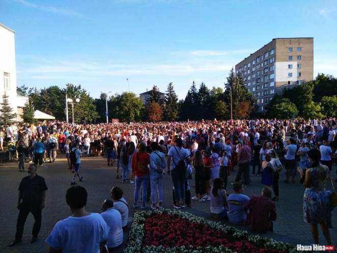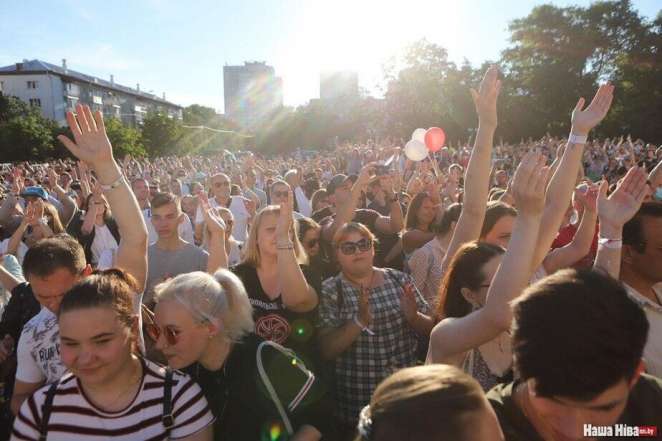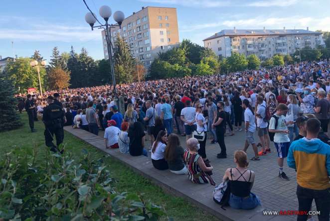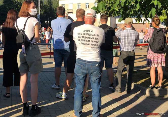 19:40. Киевский сквер. Приехал Александр Солодуха, который должен был выступать на празднике железнодорожных войск на Бангалор. Его под охраной ОМОНа завели в кинотеатр «Киев». Люди при этом скандировали «Ганьба». Выйдет ли Солодуха на сцену, пока не известно.