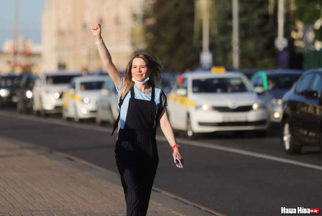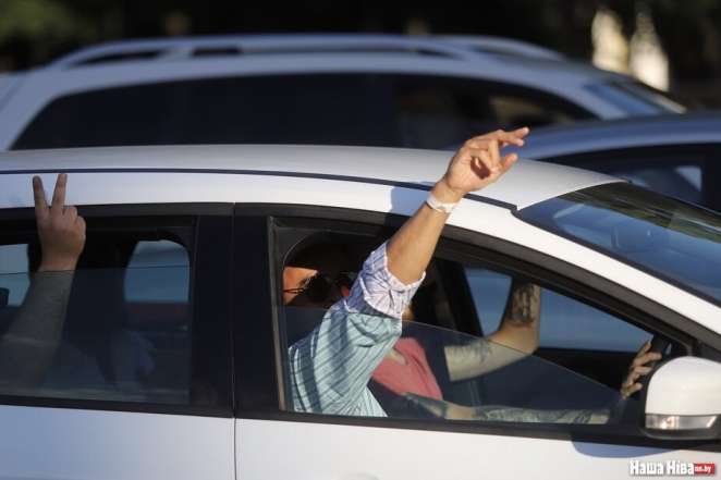 На переходе у «Вечернего Минска» собираются люди и приветствуют поднятыми руками автомобилистов. Те, кого не пускают на проспект к Вечному огню, едут сигналить по Козлова.