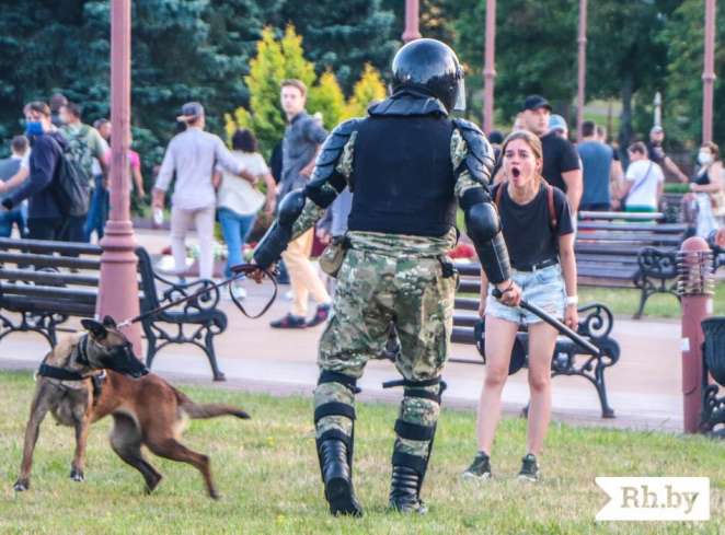 Это произошло, когда ОМОНовец с собакой и дубинкой подбежал к компании — две девушки и парень — и ударил молодого человека по ноге. Девушка начала кричать на сотрудника и возмущаться произошедшим.