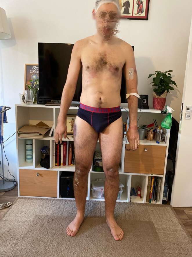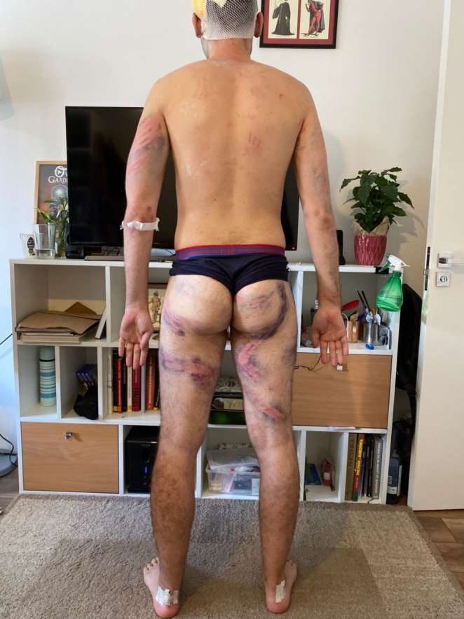 Меня осмотрела женщина-врач с улицы Окрестина. Сказала, что все хорошо. Шишки и следы от дубинки на лице не убедили ее. Как только я поднял голову над землей, захотелось блевать. Сказали, что у меня закрытая ЧМТ, надо вызывать скорую. Она ехала вечность. Рядом со мной были люди, которым было очень плохо, они стояли, стонали, у них были эпилептические припадки. Но им никто не помогал.