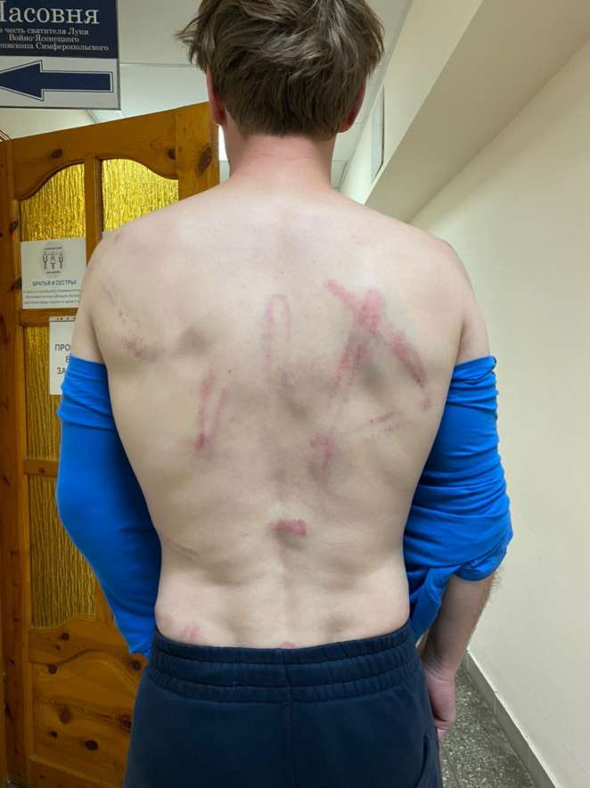 Потом нас подняли, чтобы провести в камеры. Снова нас надо было провести вдоль стены. Мне было плохо, я ничего не видел. Сказал, что мне плохо. Бросили на землю. Это было около 2 ночи. И в таком положении, в шортах и футболке, я был примерно до 6 утра. Меня дважды ударили по голове. Голова кружилась, меня рвало.