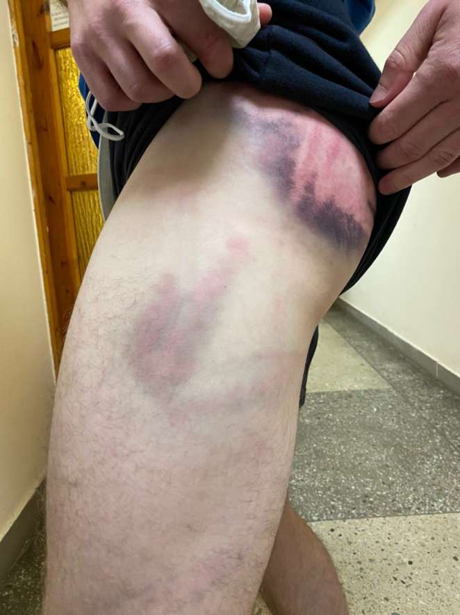 Потом приехали 2 бригады скорой помощи. Нас осмотрели. Люди в скорой помощи относились к нам намного лучше. Врач нашей бригады сказал ОМОНу, что они заберут всех, кто поместится. Нас отвезли в больницу скорой помощи, сделали первичный осмотр, описали травмы и удары. Слава богу, мои внутренние органы уцелели. Я получил только ЧМТ лекой тяжести. Сейчас я нахожусь в больнице скорой помощи, уже второй день. Все тело болело, не мог встать, все болело.