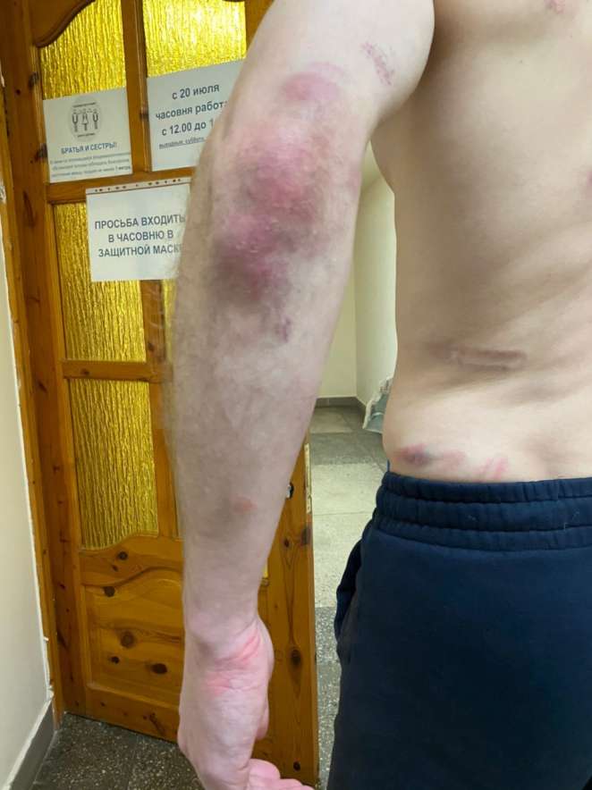 Когда мы подъехали на Окрестина, и они открыли дверь автозака, я просто выпал. Они сказали: «О, похоже, этот готов». Взяли за шкирку, выкинули из машины. Протащили по земле и оставили в траве. У меня была разбита голова, все тело посинело. Я не двигался с места и терял сознание. Меня начало рвать, изо рта лилась слюна. Они кинули фразу: «О, и этот тоже под наркотиками». В какой-то момент меня начало трясти.