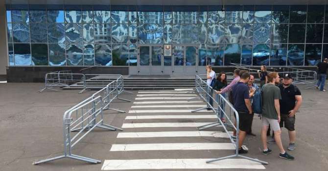 Ограждение у входа в здание, по словам сотрудников, выставили в десять вечера накануне.