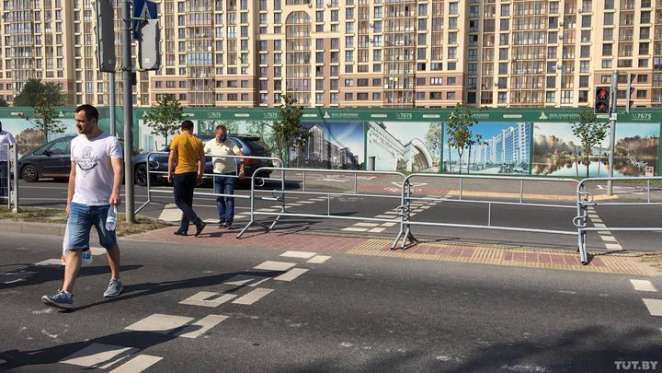 В 10.45 сотрудники в штатском поставили ограждение на островке между зебрами, на пешеходном переходе, ведущем к зданию БТ. Несколько бастующих мужчин стали убирать заграждение на островке.