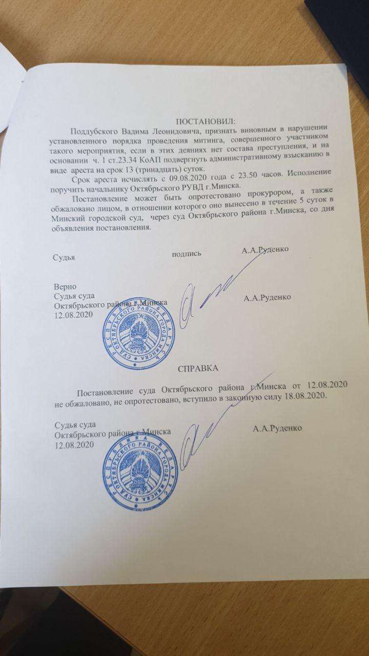 12 августа нас начали судить. Но это были не суды, даже не «тройки» знаменитые, а «двойки» – судья и какая-то девушка, которая что-то там писала. Судья зачитывал дела. У всех было написано абсолютно одно и то же: участвовал в несанкционированном митинге, выкрикивал лозунги «Жыве Беларусь!», «Позор» и «Уходи», нарушил ст. 23.34 КоАП Республики Беларусь.