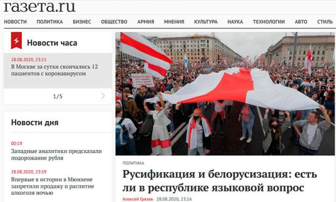 Газета.ru начинает раскручивать языковую тему. Взяв за отправную точку заявление Станислава Шушкевича о необходимости вернуть белорусскому языку статус единственного государственного, издание публикует набившие оскомину страшилки о «тотальной белорусизации» Беларуси. Для примера—небольшой фрагмент: