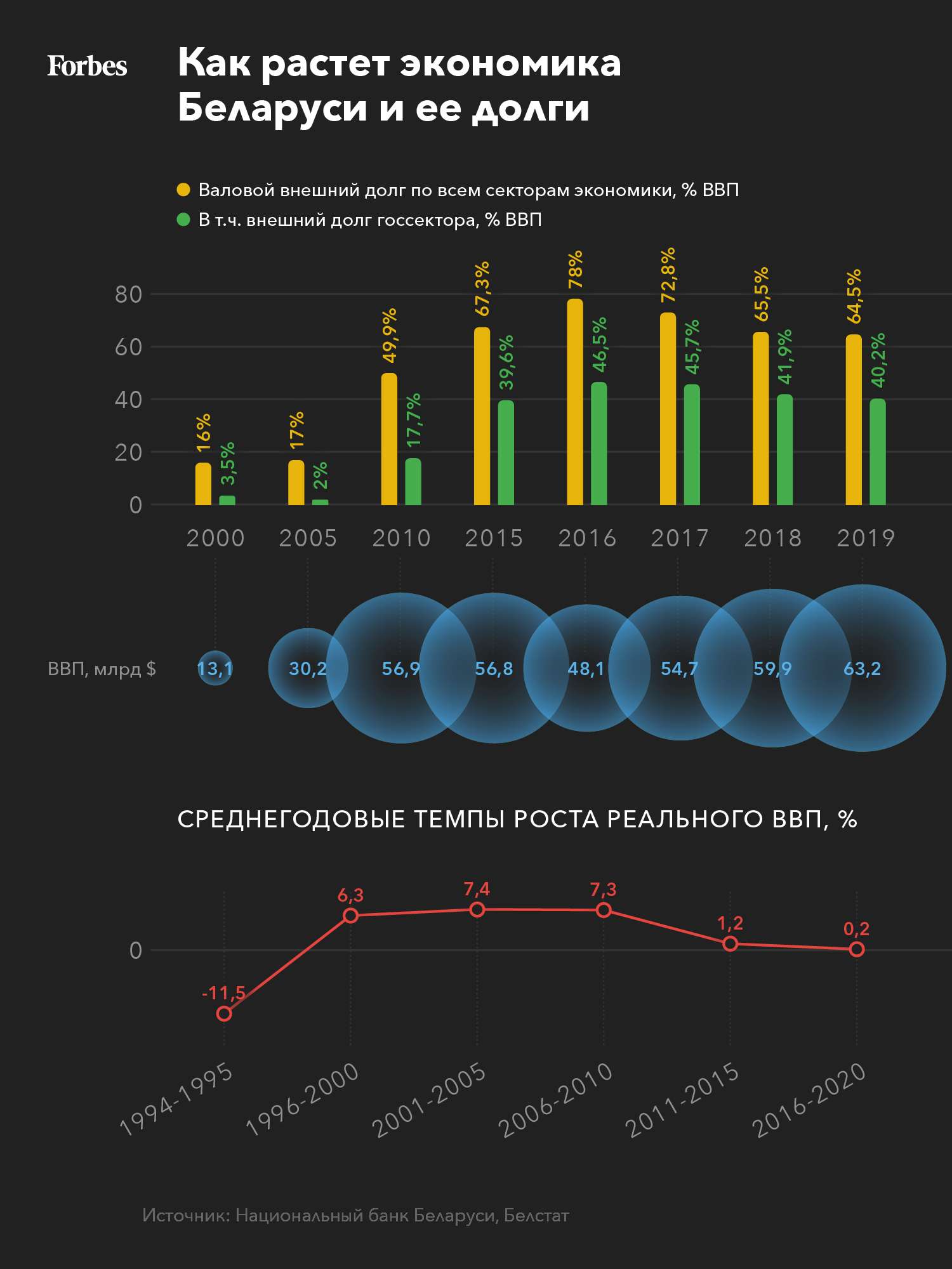 С 1994 по 2005 год Беларусь удвоила ВВП в долларовом выражении с $15,11 млрд до $30,22 млрд. Такой успех был обеспечен в основном за счет восстановления поставок белорусских товаров на российский рынок, прежде всего продукции машиностроения, химической промышленности, металлов и, конечно, удобрений, а также за счет экспорта нефти и нефтепродуктов в Европу в первой половине 2000-х годов. Затем в стране наступил уникальный период: всего за три года ее ВВП вновь удвоился — до $60,8 млрд в 2008 году. В среднем без проведения рыночных реформ, при доминировании госсектора и в режиме торгового протекционизма экономика Беларуси в 2000-е годы росла на 7% в год.