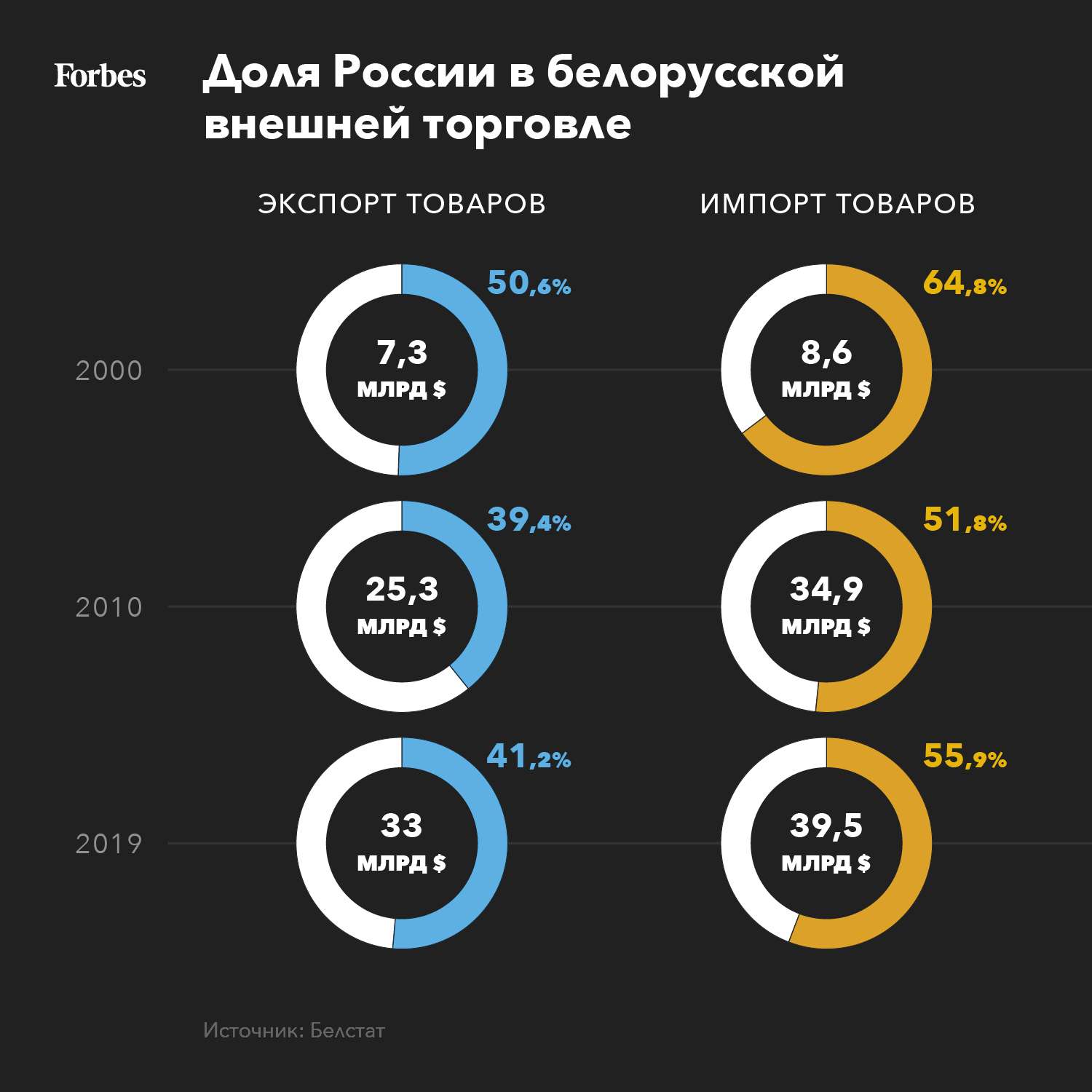 В 2019 году Беларусь обеспечивала всего 0,17% мирового товарного экспорта ($32,93 млрд). Ее доля с 1995 года стабильно варьировала в пределах 0,1–0,17%. Больше всего страна экспортировала в 2012 году — на сумму $46,1 млрд. В этом году экспорт товаров прогнозируется на уровне почти вдвое меньшем, около $24 млрд. Структура и география белорусских поставок практически не меняются и сильно зависят от режима и условий торговли энергетическими товарами. Несмотря на многочисленные декларации о диверсификации экспорта, почти половина внешней торговли, как и в 1995 году, приходится на Россию.