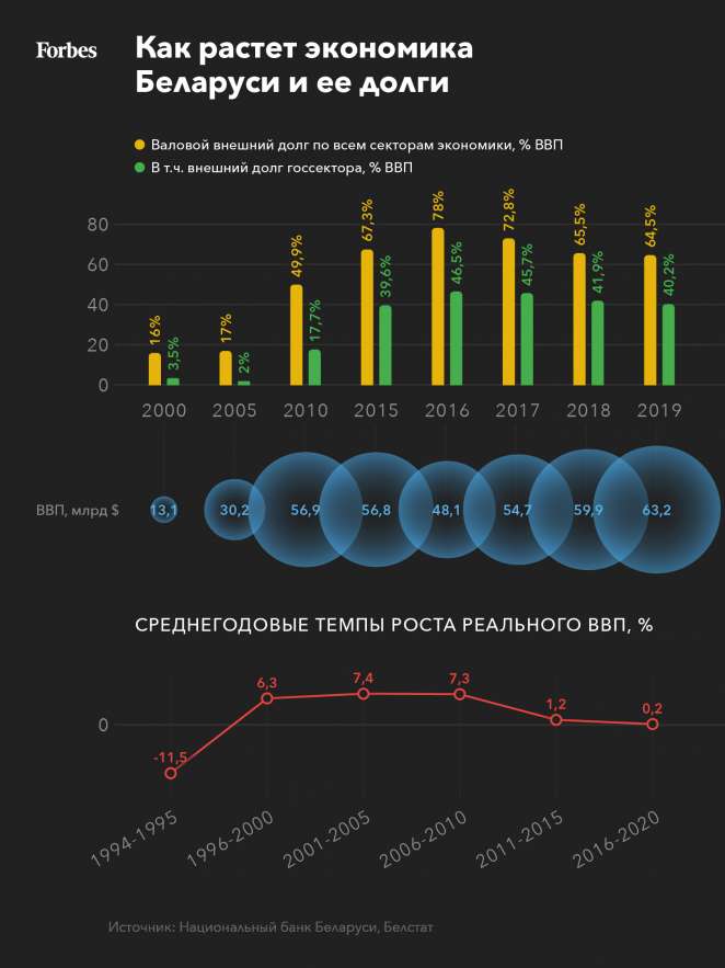 Лукашенко принял страну практически без долгов. К концу его первого срока, на 1 января 2001 года, валовой внешний долг страны вырос до $2,1 млрд, или 16% ВВП. На начало 2020 года внешний долг по всем секторам экономики составил $40,75 млрд, в том числе госдолг — $29,64 млрд, или 46,9% ВВП. А с учетом внутреннего совокупный долг Беларуси вплотную приблизился к $45 млрд (71,1% ВВП) — ;и это до произошедшей в этом году девальвации.