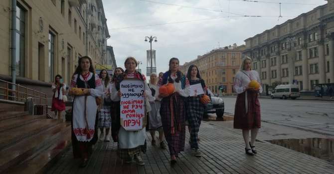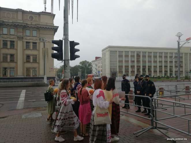 Женщины в национальных костюмах принесли на площадь Независимости тыквы, или по-белорусски гарбузы.