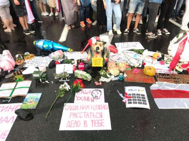 Его поздравили люди. Как пишет Tut.by, на асфальте у ограждения Дворца сложили игрушечные автозаки и вертолеты, тапки, шарики с надписями, плакаты, цветы, черный гроб с цветами и большого картонного таракана.